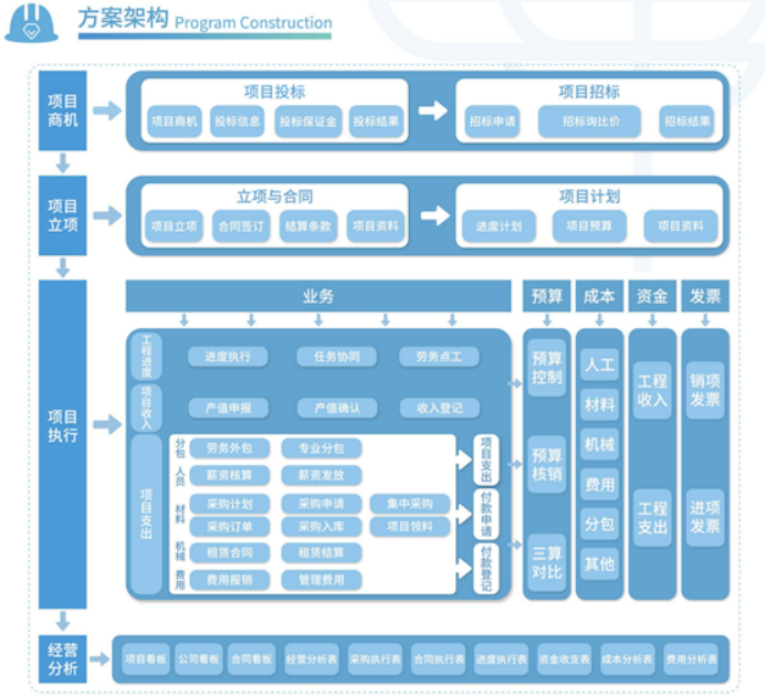 通过项企一体的全流程管理方案,实现预算管理、合同管理、结算管理、发票管理、现场管理、进度管理、劳务管理、物资管理、成本管理、资金管理、审批预警、智能分析等闭环管理。通过与钉钉开放能力的融合,实现工程ERP+协同办公+IM快速实现数字化转型升级。