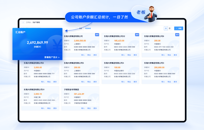 “通过资金账户管理功能,不但让公司决策者及时全面掌握账户资金情况、准确做出决策。更重要的是将前端‘项目资金管控’和后端‘账户资金管理’的流程和数据打通,通过‘业财融合’提升资金管理前后端协同能力,更好的管控资金风险、提高资金效率。”