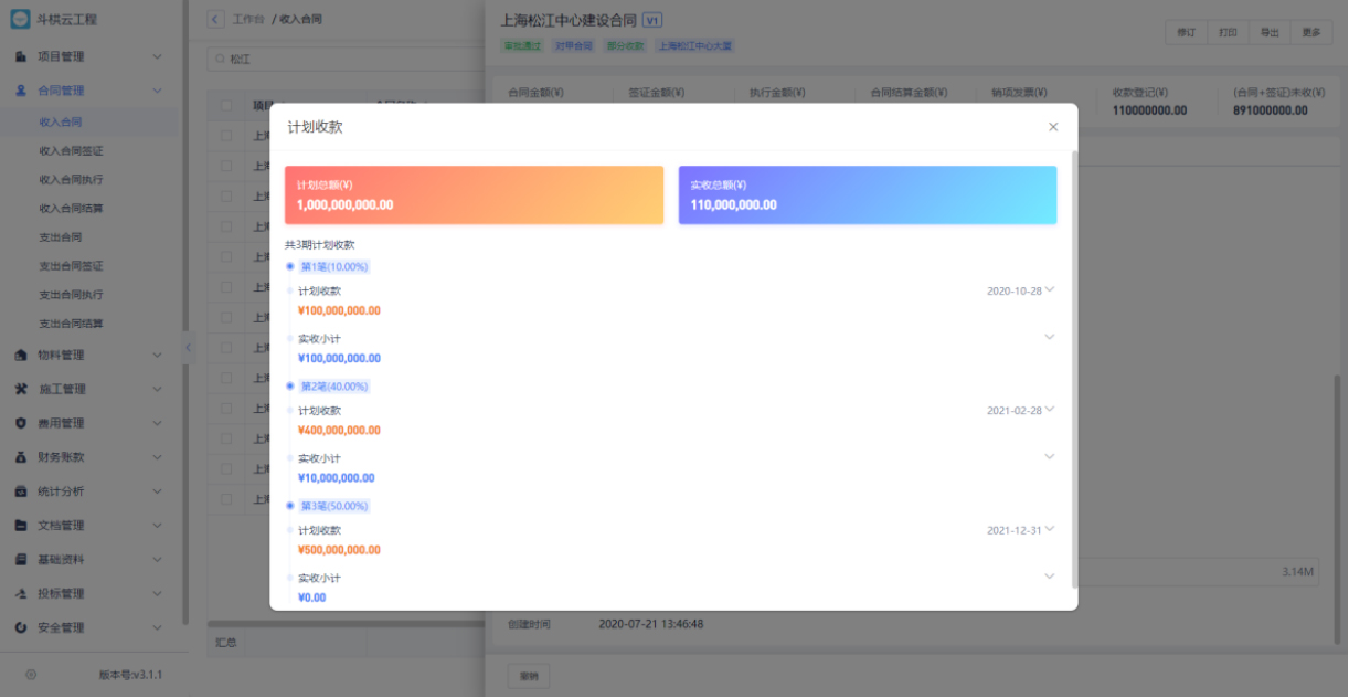 应用价值:通过斗栱云系统,各项目上可以对项目收入合同的收款计划进行及时录入和调整,公司也能依据收入合同的进度、工程量等数据快速评估收入计划的合理性,提升计划编制的效率和质量。此外,与实际回款的自动统计比对,也能帮助公司和项目总结收款计划编制问题,持续改进计划编制准确率。