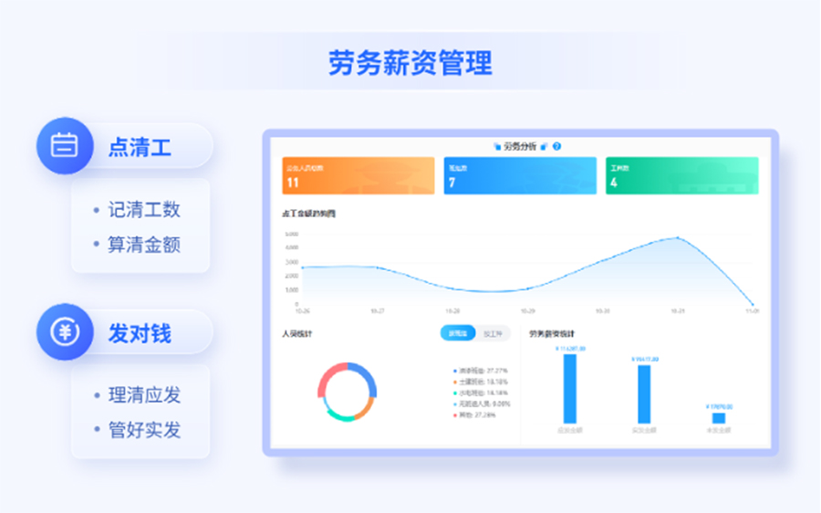 通过斗栱云系统,可以帮助高效完成点工和薪资管理,规范业务流程,管理资料存档,从而帮助提升劳务薪资管理效果,规避劳务工人薪资纠纷风险。