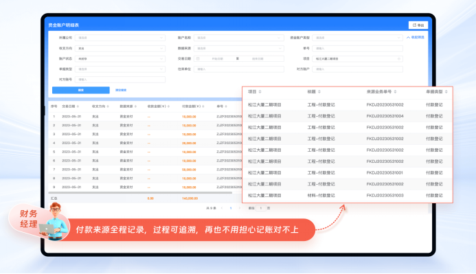 对收支单据进行统一管理,针对已经完成的收支数据系统自动生成资金账户流水与明细报表,让财务人员轻松捋清每一笔款的业务来源,让老板快速掌握公司总体及每个资金账户可用资金,便于快速决策与资金安排。