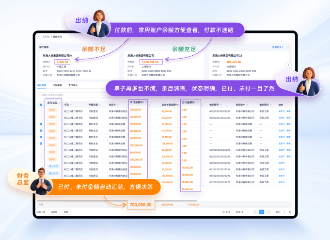 斗栱云账户管理模块可根据不同的账户类型与用途进行分类管理。并且会对每笔收支后的账户余额实时计算,让操作者在付款前心中有“数”,并且还有“汇总账户”的余额统计,方便管理者及时获知账内余额情况,便于资金决策。