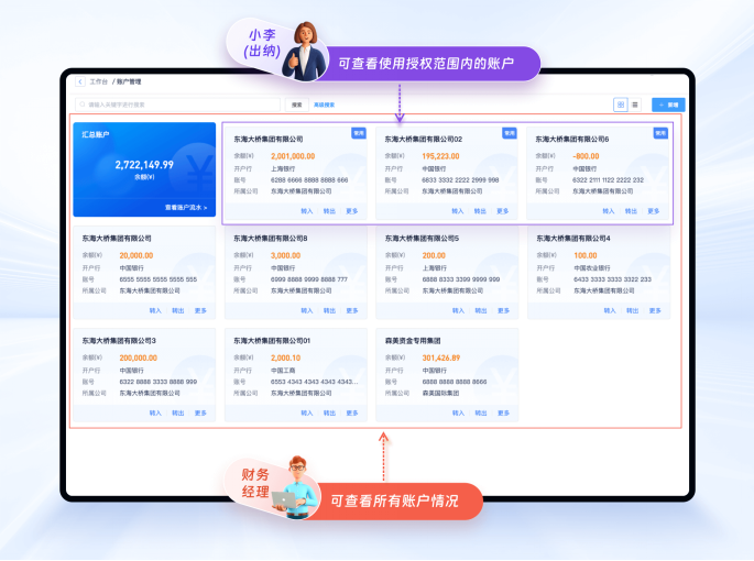 系统有完善的权限体系,非授权人员无法查看账户模块内容。同时在系统中关联账户的地方都隐藏了敏感信息,如账户余额、往来流水等,只有被账户授权的人员才能看到内容,全面保障资金信息安全。