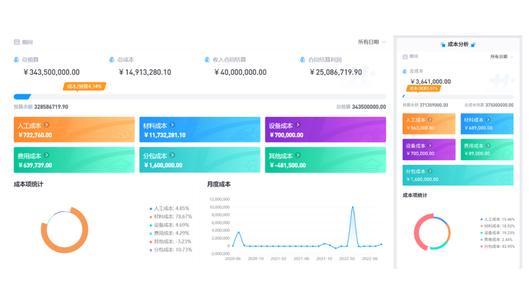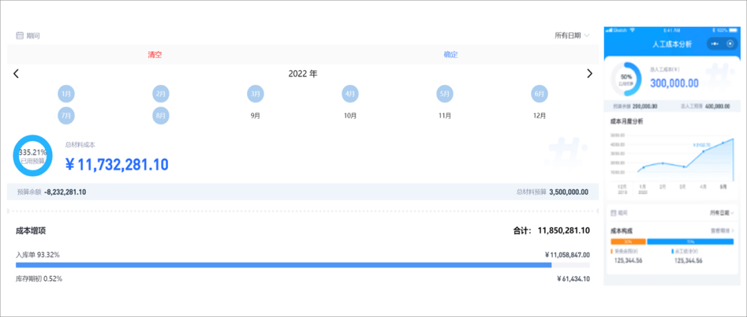 按时间、按类型多维度的成本自动统计分析,多角度综合分析成本现状与问题。选择月份即可快速回溯前期成本情况,分析成本变化趋势。