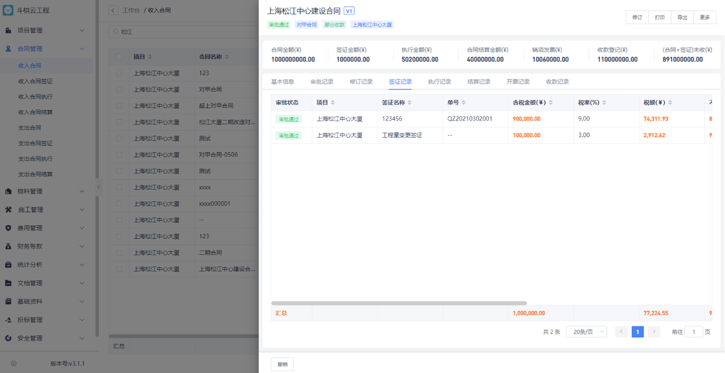 应用价值:通过斗栱云系统,项目上可以随时随地用手机快速填报签证变更数据,一键拍照上传原始单据。公司管理或结算人员也能随时掌握合同的签证变更金额以及合同当前的总金额,一键查阅签证变更明细,从而提升签证变更管理效率和规范性,为结算和回款提供依据。