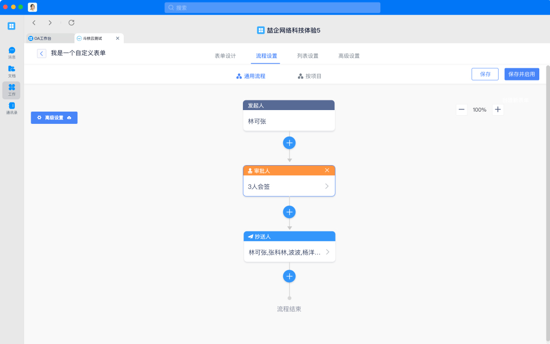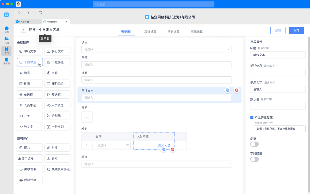 流程表单:结合表单和工作审批流程。完成表单设计后,需要对审批流程和规则进行设计,当人员填写表单后即发起流程,流程将流转给相应负责人员进行审批。