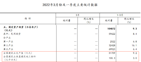 国家统计局:2022年一季度全国建筑业总产值51709亿元!同比增长9.2%!