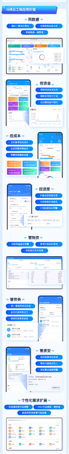 斗栱云工程通过开箱即用的工程项目管理SAAS系统,使建企无需长时间投入大量人员进行系统建设,就能快速建立数字化工程项目管理体系,实现资金、成本、进度、物资、劳务、质安等各方面的高效管理,帮助建企迅速抓住机遇,实现“回血”甚至“弯道超车”