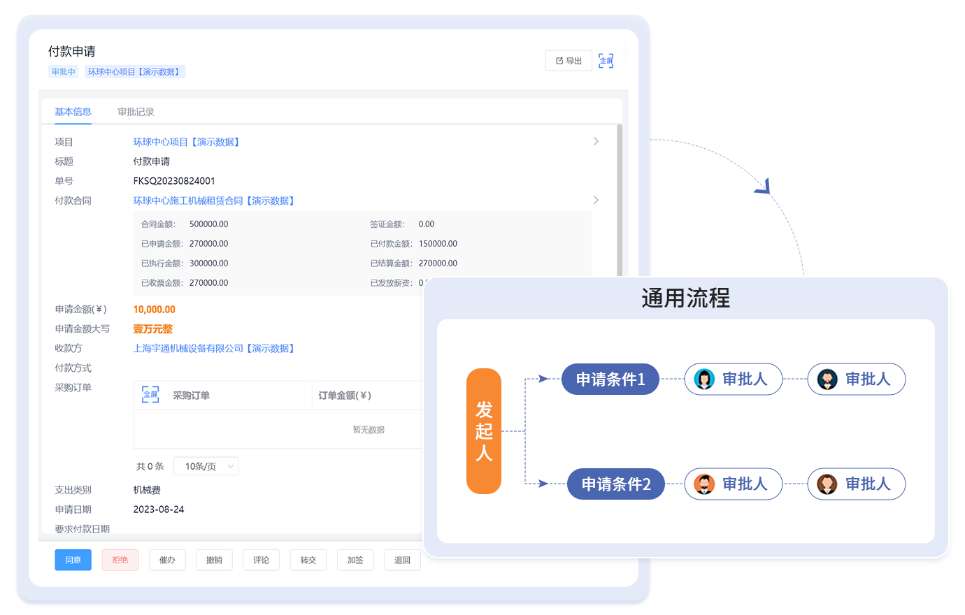 同意、拒绝、撤销、评论、转交、加签、退回、手签···,丰富的审批应用满足各种审批场景