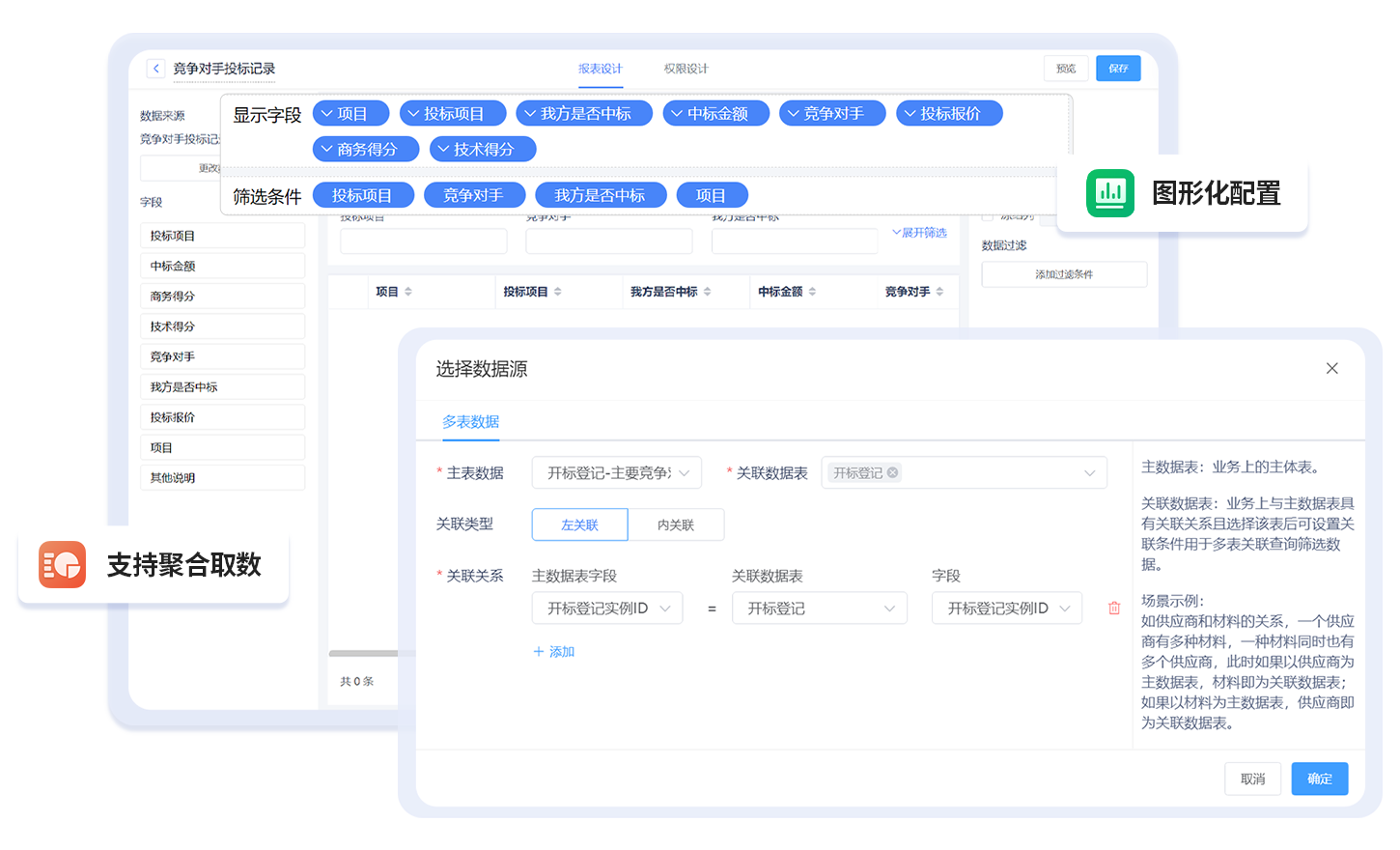 不仅支持从单一数据表单取数,还支持从多个数据表单关联聚合取数,支持更多统计场景