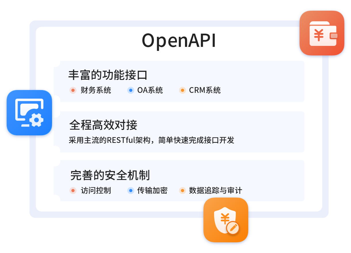 支持从基础档案到各类业务数据丰富的API接口,企业可以此自行开发与财务、OA、CRM、采购、档案等等各种三方系统的数据对接