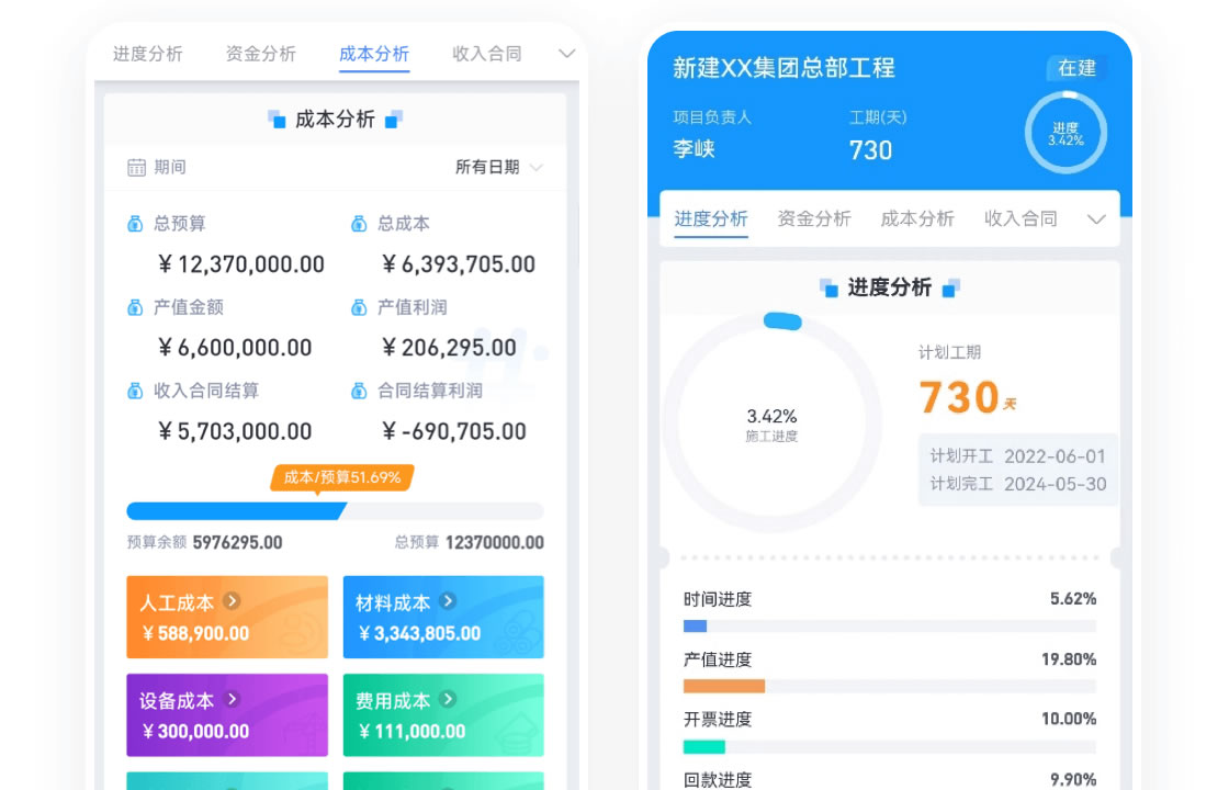 项目进度、产值、现场图片等各类数据在线汇报,延期偏差自动识别,减少人工对接采集工作量,大量项目从容管理